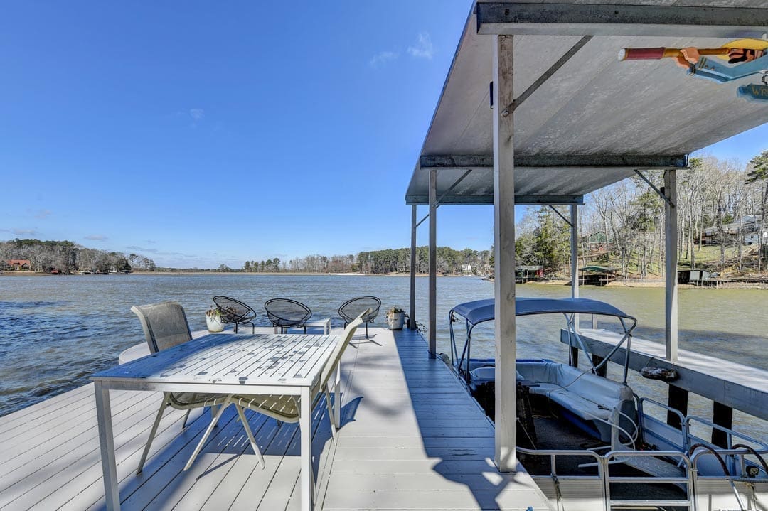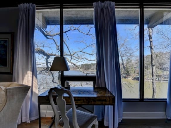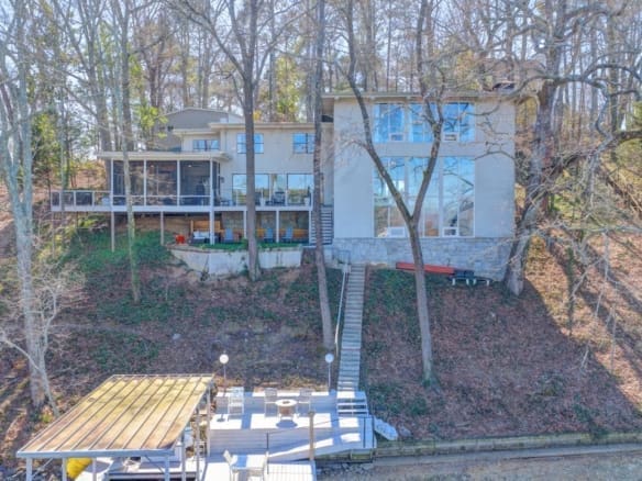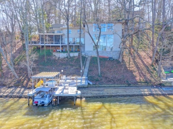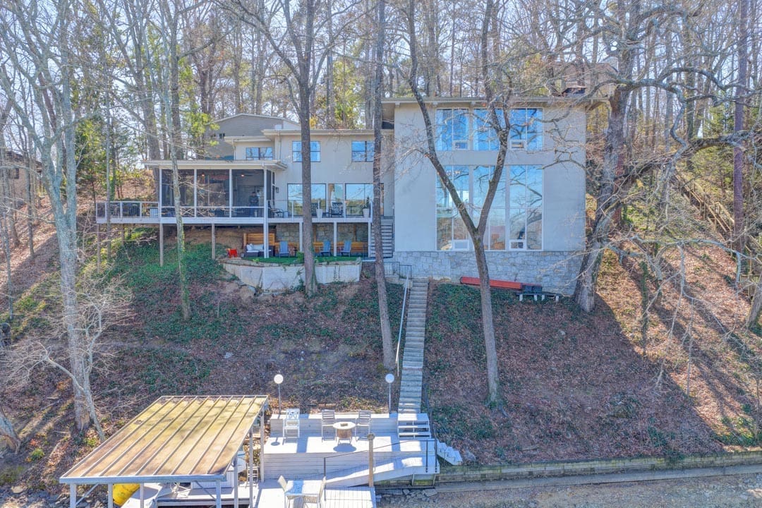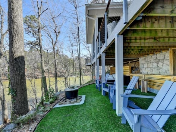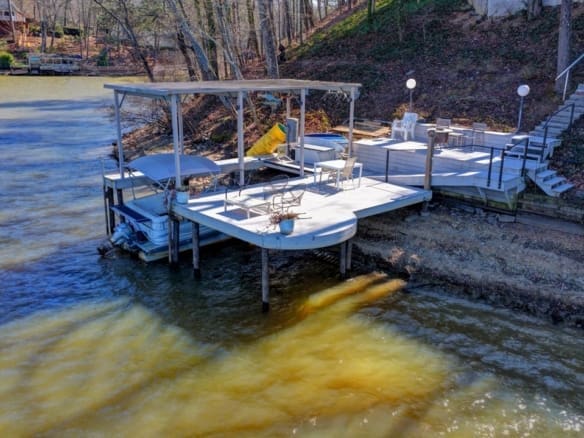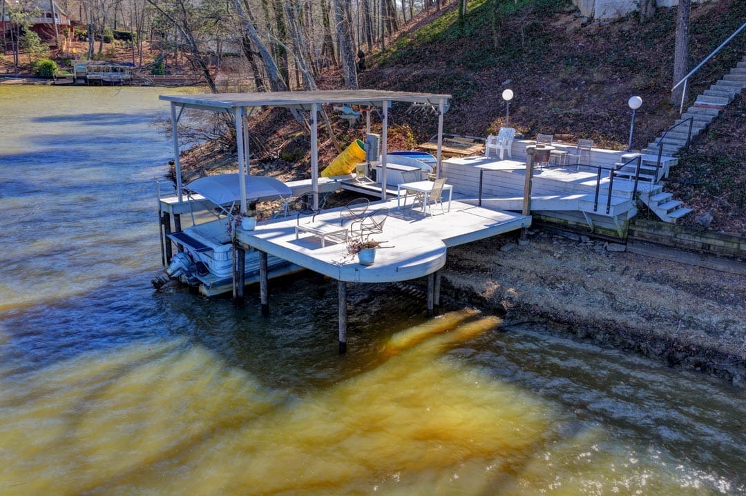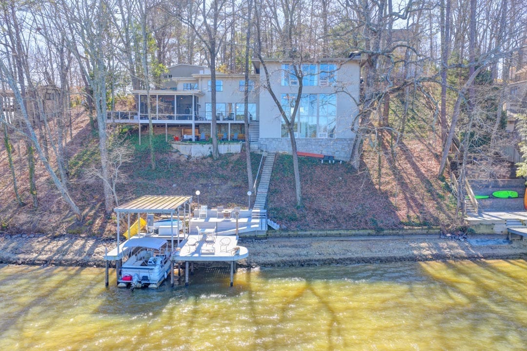 Premier Views on Berkeley Lake, directly across from the beach on the main portion of the lake for fantastic sunsets, the annual fireworks and the deepest part of the lake! You feel like you are in a tree house. Enjoy the purple martins, bald eagles, blue heron and so many more who make Berkeley Lake their nest! Home has been updated from top to bottom and sf added via a loft area, perfect for a floating dining area in the stars. Additionally, a massive primary closet has been added. The Primary bedroom suite, located on its own wing off the main entry area affords extreme privacy while offering the best views in the house through floor to ceiling windows. The brand new primary bath features a soaking tub providing both air and water jets, dual vanities and an oversized shower, all finished in stone and tile to bring nature within. The newly created primary closet is custom designed by the owner/contractor with storage it’s best feature. The Primary plus two other bedrooms and full bath are on the main level, the staircase at entry leads down to the entertaining level for easier access to the lake. Multiple outdoor areas including two decks, massive screened-in porch, partially covered turf area with fire pit, another fire pit adjacent to single slip boat dock and large dock area for additional enjoyment. Three interior fireplaces makes for ambiance inside and out. The kitchen is such a joy to entertain in. The cook has great space to work and also entertain a crowd of guests at the huge center island set up for seating on two sides. Nothing was spared in this revamped kitchen. Top-of-the-line appliances, fantastic prep areas, coffee bar, storage everywhere and all of this while looking through the windows and screened porch at the best views on Berkeley Lake. This home is at the curve where the channel meets the big part of the lake and enjoys deep views of both. Optional HOA for use of the lake, beach, 2 pavilions with grills, smokers, fire pits and so many activities for families, adults and kiddos activities including kids fishing lessons and beach camp outs-THIS is the community where memories are made! Pontoon boat can stay and has a HONDA 9.9HP Outboard motor Boat dock has custom lighting underneath to create a year round aquarium every evening and LED lights that use remote to light up the dock as you return from an evening boat ride. No reason to go on vacation again-you can live in PARADISE! The left side of the home including the master suiite and great room was added to the structure in 1970. The office and dining area above was completed during current owner’s ownership!
